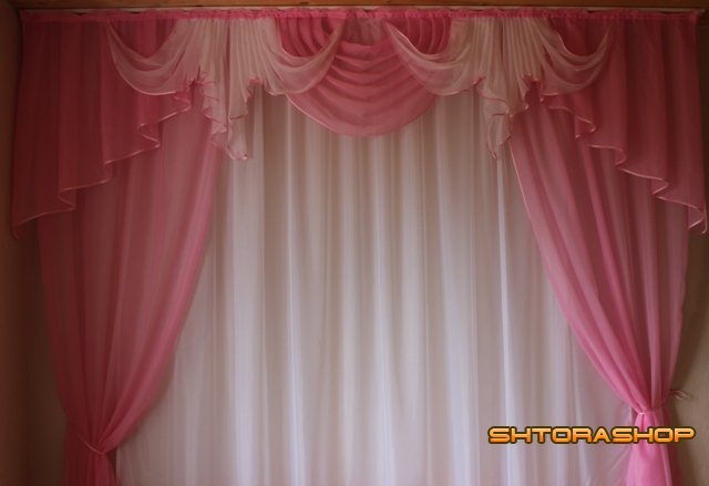 Шторы состоят из: однотонной вуали, но можно применять и однотонную портьеру, тюля - это обычно вуаль с утяжелителем, ламбрекен выполнен также из однотонной вуали или же может быть выполнен из портьеры.