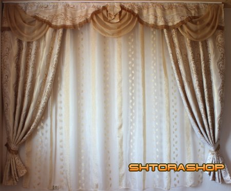 Шторы состоят из: портьерной ткани с рисунком цветов, причем цвет ткани может быть разный, тюля - это обычно органза или вуаль с утяжелителем, ламбрекен выполнен из портьерной ткани и однотонной вуали.
