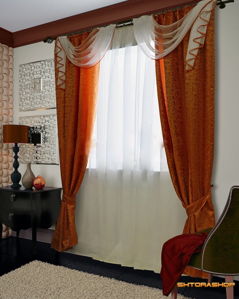 Модель Лира выполнена из однотонной портьерной ткани и однотонной вуали. Рекомендуемый карниз для данной модели от 2 до 3 метров.