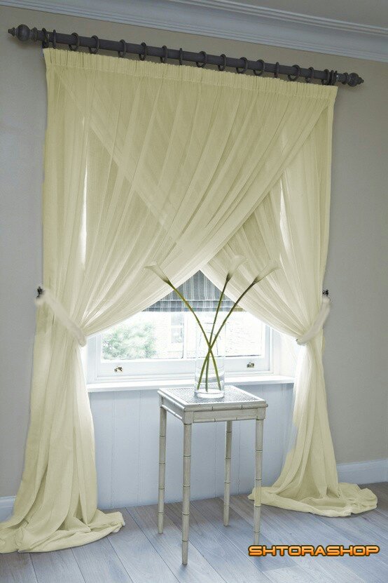Данная модель состоит из двух частей однотонной вуали, по 4 метра шириной, сшитой на одной шторной ленте. Высоту и цвет можно изменить по желанию.