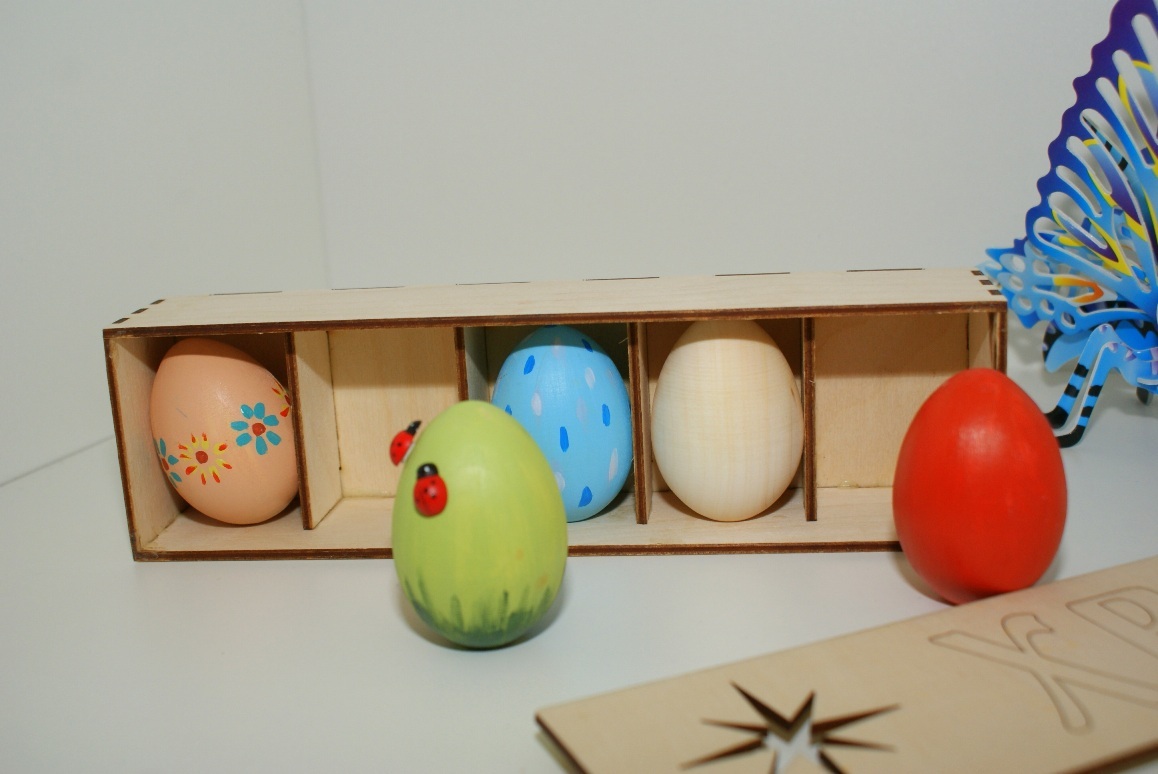 В наборе: коробка из фанеры, 5 яиц из дерева