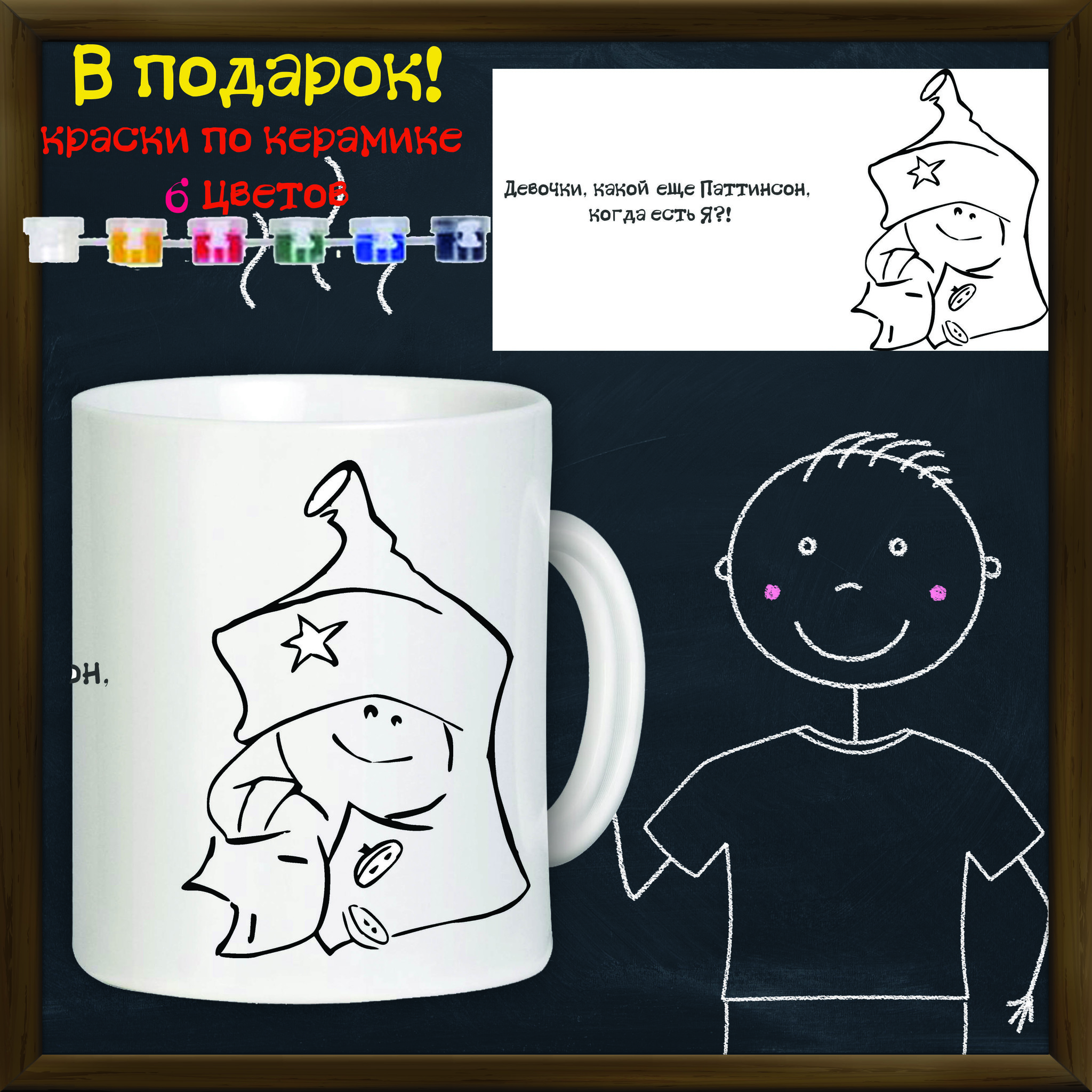 Состав: керамическая кружка, краски по стеклу/керамике 6 цветов, инструкция.