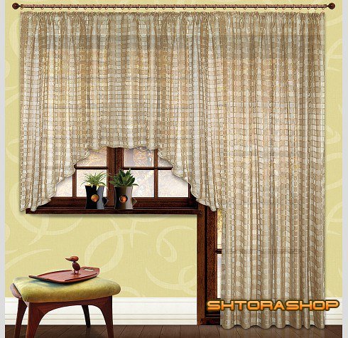 Штора состоит из дух элементов: арки и полотна на дверной проем. Арка и штора на разных шторных лентах. Ширина арки без учета сборки 4метра, ширина шторы без учета сборки 2метра. Штора выполнена из вуали с рисунком сетки.