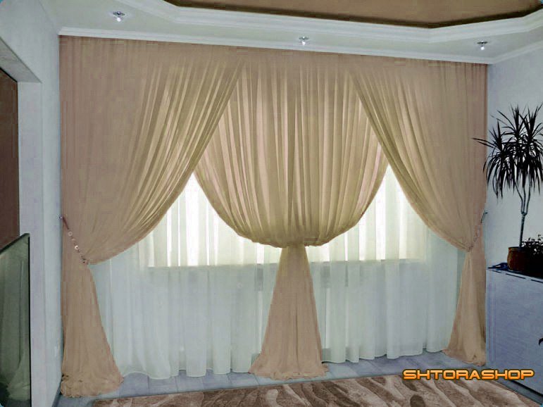 Шторы состоят из тюля, выполненные из однотонной вуали, комбинированные портьерами другого цвета, так же из вуали. В комплект входит тюль шириной 6 метров (без учета сборки), три портьеры: ширина центарльной портьры 5 метров (без учета сборки), ширина боковых портьер 2,7м( без учета сборки), а так же 3 прихвата. Комбинацию цветов Вы можете предложить свою.