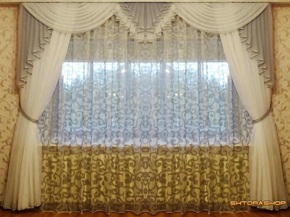 Шторы состоят: из ламбрекена, выполненного из вуали, в сочетании двух цветов, тюля, который выполнен из ткани имитация льна вензеля, комбинированные портьерами из вуали. В комплект входит тюль шириной 5 метров (без учета сборки). Тюль можно выбрать в комплект другой. Две портьеры шириной 2,7 метра каждая, ламбрекен 3метра, а так же 2 прихвата. Комбинацию цветов Вы можете предложить свою.