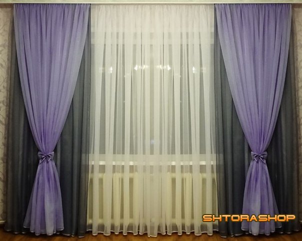 Шторы состоят из тюля, выполненные из однотонной вуали, комбинированные портьерами из двух цветов, так же из вуали. В комплект входит тюль шириной 6 метров (без учета сборки), две портьеры, каждая состоит из двух полотен (два полотна сшиты) шириной 2,7 метра (без учета сборки), а так же 2 прихвата. Комбинацию цветов Вы можете предложить свою.