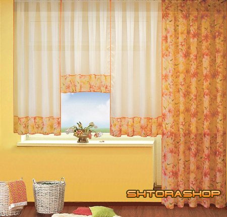 Шторы состоят из: однотонной вуали и вуаль-печати, обработанная косабейкой.